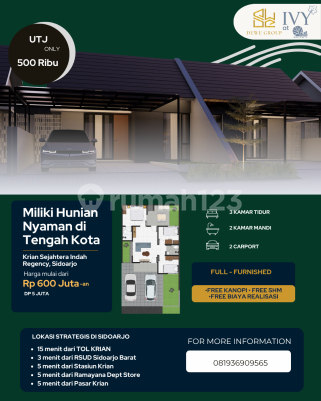 Rumah di Krian. Cek segera rumah 1 lantai yang asri ini, dijual dengan pemandangan indah yang menambah nilai estetika di lingkungan hunian. Rumah ini berada di area strategis serta menawarkan lingkungan fasilitas yang lengkap, cocok untuk Anda yang menginginkan hunian aman. Spesifikasi Utama Properti: - Kamar Tidur: 3 - Kamar Mandi: 2 - Sertifikat: HGB - Hak Guna Bangunan - Arah Bangunan: Menghadap Selatan - Kondisi Perabotan: Furnished Dilengkapi dengan: - Masjid. - Keamanan 24 jam. - One Gate System. - Taman. Fitur unggulan: - Full Furnished. - Bonus Canopy. - Bonus Furniture. - Dekat Fasilitas Kesehatan. - Dekat Sekolah Negeri. Terletak di Krian, rumah ini memberikan kemudahan akses ke berbagai fasilitas menarik. Dengan harga Rp. 3.000.000, anda bisa memiliki hunian terbaik yang sudah siap huni dan bersertifikat HGB - Hak Guna Bangunan. Manfaatkan kesempatan untuk menikmati pengalaman tinggal di kawasan Krian yang nyaman ini! Kontak segera untuk informasi lebih lanjut!