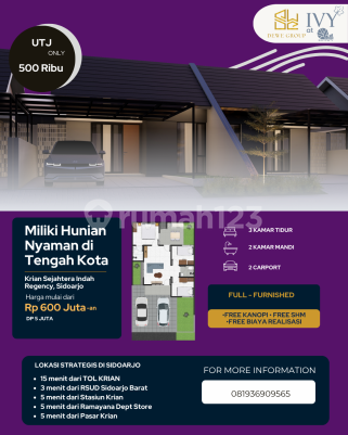 Kesempatan terbatas buat Anda dapatkan rumah nyaman dengan return investasi tinggi di Krian, Sidoarjo. Rumah ini menawarkan lokasi yang strategis serta memiliki jumlah lantai 1 yang siap untuk segera Anda miliki, utamanya bagi Anda yang mencari hunian di lokasi yang terjangkau. Kondisi properti ini bagus dan memiliki desain unik yang menambah daya tarik dan estetika properti ini. Rumah ini berada di area strategis. Detail Properti ini adalah: - Kamar Tidur: 3 - Kamar Mandi: 2 - Sertifikat: HGB - Hak Guna Bangunan - Arah Bangunan: Menghadap Selatan - Kondisi Perabotan: Furnished Tersedia berbagai fasilitas lengkap, seperti: - Keamanan 24 jam. - Masjid. - One Gate System. - Taman. - Taman. Tidak hanya itu, namun properti ini juga memiliki keunggulan sebagai berikut: - Bonus Canopy. - Siap Huni. - Bonus Furniture. - Dekat Fasilitas Kesehatan. - Dekat Sekolah Negeri. Lokasi Strategis terletak di Krian, properti ini memudahkan akses Anda ke fasilitas-fasilitas utama dan unggulan. Harga yang sangat kompetitif yaitu, Rp. 5.000.000, rumah ini siap menjadi milik Anda! Nikmati segala kemudahan dan berbagai keunggulan menarik saat properti premium ini milik Anda.