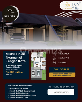 Rumah 1 lantai di Krian, Sidoarjo. Dijual rumah di wilayah yang asri. Properti 1 lantai ini berada di lingkungan strategis. Kategorinya adalah sebagai berikut: - Kamar Tidur: 3 - Kamar Mandi: 2 - Sertifikat: HGB - Hak Guna Bangunan - Hadap: Selatan - Kondisi Perabotan: Furnished Tentunya properti ini layak untuk dimiliki karena: - Bonus Canopy. - Siap Huni. - Bonus Furniture. - Dekat Fasilitas Kesehatan. - Dekat Sekolah Negeri. Properti ini telah lengkap dengan fasilitas: - Keamanan 24 jam. - Masjid. - One Gate System. - Taman. - Taman. Keberadaan rumah berikut mudah dijangkau, hanya selangkah menuju berbagai fasilitas utama dan menarik. Dengan Rp. 0, anda dapat langsung dapatkan rumah istimewa di daerah Krian ini.