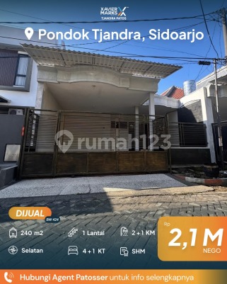 DIJUAL RUMAH DI PONDOK TJANDRA LT 240 m2 (8x30) Luas bangunan full 1 lantai KT 4+1 KM 2+1 Hadap Selatan tembus ke Utara SHM Listrik 5500 watt APDAM AC.6 unit Water Heater 2 unit Harga 2.1M nego Hub: Brigitta Wong 0811309xxxx Xmarks Tjandra Patos Pondok Tjandra dekat dengan Gerbang Tol Juanda, Gerbang Tol Tambak Sumur, Bandara Internasional Juanda, Stasiun Waru, Stasiun Sidoarjo, RS Mitra Keluarga, RS Bunda, RSIA Prima Husada, Sekolah Petra Acitya, SMAN 1 Waru, Singapore National Academy, Universitas UPN Veteran Jawa Timur, UIN Sunan Ampel Kampus 2, Universitas Sunan Giri, Universitas Kristen Petra, Politeknik Pelayaran, ITS, Superindo, Galaxy Mall, City of Tomorrow, Pondok Tjandra Indah Sports Club, clubhouse, area bisnis dan community, kafe, ATM center, serta berbagai pusat kuliner dan fasilitas umum lain di sekitar Waru dan Sidoarjo.