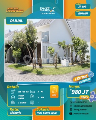 DIJUAL CEPAT RUMAH HOOK Puri Surya Jaya Cluster Valencia Garden Surat : SHM Hadap : UTARA - BARAT LT : 159 m² (10x16) LB : 65 m² KT : 2, KM : 1 Rumah + furnished Masing² kamar ada AC & spring bed Lokasi pojok, masih ada sisa halaman yg cukup lebar BONUS FURNISHED: Kursi tamu, beberapa mebel, gorden, AC, wallpaper Harga : 980jt nego BU cpt, URGENT, penawaran brp pun dipertimbangkan. Hubungi : Jenni_08224587xxxx XMarks Patos PAKUWON CITY MALL Puri Surya Jaya dekat dengan Gedangan, Waru, Buduran, Rungkut, Kawasan Industri SIER, Bandara Internasional Juanda, Gerbang Tol Waru-Juanda, Stasiun Gedangan, RS Mitra Keluarga Waru, RS Bunda, RSIA Prima Husada, Lippo Plaza Sidoarjo, Transmart Sidoarjo, Royal Plaza Surabaya, Universitas Nahdlatul Ulama Sidoarjo, UIN Sunan Ampel (jalur Rungkut), SMA & SMP Al Muslim, SDS Muhamadiyah 2, serta berbagai pusat kuliner, perumahan, dan area komersial yang berkembang pesat di koridor Surabaya-Sidoarjo.