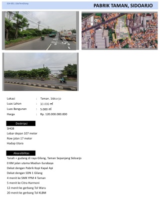 Di Jual Tanah + Gudang di Raya Gilang, Taman Sepanjang - Sidoarjo Posisi O KM jalan raya provinsi Row jalan 17 meter Dekat dengan Pabrik Kopi Kapal Api Dekat dengan SDN 1 Gilang 5 menit ke Citra Harmoni 12 menit ke gerbang Tol Waru 20 menit ke gerbang Tol KLBM Detail: Surat HGB Hadap Utara Lebar depan 107 meter Luas Tanah 33.000m² Bangunan 5.000m² Harga Rp. 120.000.xxx.000 Apraisal Bank Rp 160.000.xxx.000