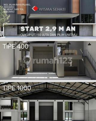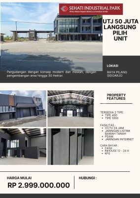 PERGUDANGAN PREMIUM DI SIDOARJO! HARGA MULAI 2 M-AN :fire: Launching Tahap 1 - Sehati Industrial Park :fire: Jangan lewatkan kesempatan emas ini! Sehati Industrial Park, pergudangan modern dan strategis di Sidoarjo. Pastikan Anda mengamankan unit terbaik sebelum kehabisan! LOKASI STRATEGIS - NOL Jalan Raya - Hanya 15 Menit dari Gerbang Tol terdekat. - Berada di Kawasan Industri yang sudah berkembang. PILIHAN TIPE GUDANG : - Tipe 400 : 11,5 x 34 meter - Tipe 1000: 23 x 48 meter FASILITAS KEAMANAN & PENDUKUNG - One Gate System - CCTV 24 Jam - Jaringan PDAM - Fasilitas Musholla & Kantin ******** UNIT SIAP DIPILIH! TERSEDIA UNIT READY STOCK & INDEN! Anda bisa langsung memilih unit sesuai kebutuhan Anda. JANGAN TUNDA! Tipe 400 : - Luas tanah : 11,5 x 34 - dimensi banggunan : 11,5 x 30 - Luas kantor lantai 1 : 5,9 x 4,4 - Luas kantor lantai 2 : 4,5 x 4,4 - Sepadan : 11,5 x 4 - Toilet : 1 - Floor to ceiling : 8,8m Tipe 1000 : - Luas tanah : 23 x 48 - dimensi banggunan 23 x 42 - Luas kantor lantai 1 : 4,5 x 4,4 - luas kantor lantai 2 : 4,5 x 4,65 - sepadan : 23 x 6 - Toilet : 2 - Floor to ceiling : 10 m