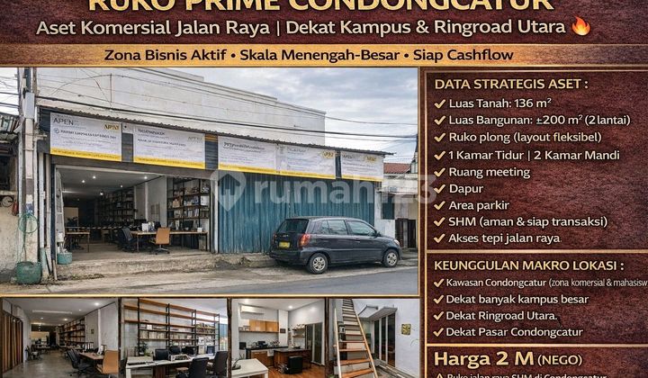 Peluang akuisisi ruko strategis di Condongcatur - Depok Sleman, kawasan dengan perputaran ekonomi tinggi yang ditopang oleh kampus, mahasiswa, perumahan, dan jalur utama kota. Properti berada tepi jalan raya, memberikan visibilitas usaha maksimal dan kemudahan akses. Bangunan 2 lantai dengan konsep ruko plong, fleksibel untuk berbagai skema bisnis maupun holding asset jangka menengah-panjang. Cocok untuk investor besar yang mengincar sewa stabil, operasional sendiri, atau redevelop ringan. DATA STRATEGIS ASET Luas Tanah 136 m² Luas Bangunan ±200 m² Bangunan 2 lantai Ruko plong (layout fleksibel) 1 Kamar Tidur | 2 Kamar Mandi Ruang meeting Dapur Area parkir SHM (aman & siap transaksi) Akses tepi jalan raya KEUNGGULAN MAKRO LOKASI Kawasan Condongcatur (zona komersial & mahasiswa) Dekat banyak kampus besar Dekat Ringroad Utara Dekat Pasar Condongcatur Lingkungan padat aktivitas & kebutuhan harian ALASAN INVESTOR BESAR MASUK ✅ Lokasi usaha hidup sepanjang hari ✅ Cocok kantor, klinik, retail, F&B, startup hub ✅ Potensi sewa cepat & likuid ✅ Nilai tanah koridor Condongcatur naik konsisten ✅ Exit strategy kuat (mudah dialihkan) Harga: 2 M (nego rasional) ⚠️ Ruko jalan raya SHM di Condongcatur semakin terbatas :fire: Siap diambil & dijalankan investor besar