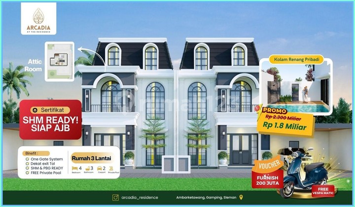 Dijual Rumah Mewah Dalam Cluster Sleman Depan Rs Pku Gamping Rasakan kemewahan tinggal di Gamping dengan hunian 3 lantai, lengkap dengan Attic Room eksklusif & kolam renang pribadi. Desain modern, lingkungan premium, dan akses strategis ke pusat Jogja. Lokasi Strategis: - Selangkah ke RS PKU Gamping & Al Azhar International - Akses mudah ke kota Jogja - Cluster One Gate System - Security 24 jam - Lahan matang & siap bangun Spesifikasi Rumah: - 3 Lantai + Attic Room (ruang serbaguna) - Kolam Renang Pribadi - 4 Kamar Tidur - 3 Kamar Mandi - Carport muat 2 Mobil - SHM & PBG READY Info Sekitar : - Dekat Rs PKU Muhammadiyah - Dekat kampus Umy - Dekat pasar Gamping - Dekat Malioboro Privasi, kenyamanan, dan prestige semuanya ada di sini. Booking sekarang, unit sangat terbatas!