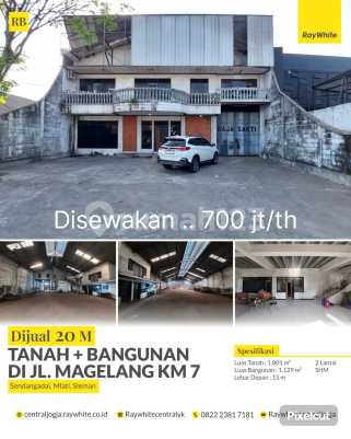 Bagi anda yang sedang mencari lahan untuk dijadikan gudang atau tempat usaha lainnya,Bangunan 2 lantai ini bisa dijadikan sebagai pilihan. Berada di pusat keramaian,daerah bisnis jl magelang km 7,memiliki luas tanah 1801 meter persegi dan luas bangunana 1129 dengan lebar depan 15 meter. NO PAP : 23-1143