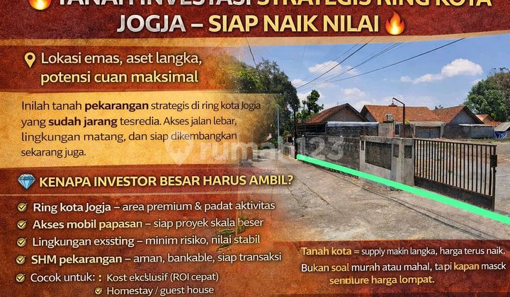 Lokasi emas, aset langka, potensi cuan maksimal Inilah tanah pekarangan strategis di ring kota Jogja yang sudah jarang tersedia. Akses jalan lebar, lingkungan matang, dan siap dikembangkan sekarang juga. KENAPA INVESTOR BESAR HARUS AMBIL? ✅ Ring kota Jogja - area premium & padat aktivitas ✅ Akses mobil papasan - siap proyek skala besar ✅ Lingkungan existing - minim risiko, nilai stabil ✅ SHM pekarangan - aman, bankable, siap transaksi ✅ Cocok untuk: Kost eksklusif (ROI cepat) Homestay / guest house Townhouse / cluster Land banking (capital gain tinggi) Tanah kota = supply makin langka, harga terus naik. Bukan soal murah atau mahal, tapi kapan masuk sebelum harga lompat. ⏳ PROPERTI INVESTASI SEPERTI INI TIDAK NUNGGU PEMBELI. Yang serius akan survey duluan, deal belakangan. Hubungi sekarang - prioritas untuk investor siap transaksi. Once sold, almost impossible to find similar land in this area.