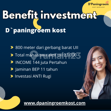 D'Paningroem Kost Exclusive selangkah ke Kampus UII-Jogja, profit konsisten tiap bulan! Spesifikasi: - K3 type 100/125 - Kamar Tidur: 8 - Kamar mandi: 8 - Dapur - Gudang - Balkon - Taman - Carport: 2 mobil - Sumber air: Sumur - Akses Jalan Aspal - Legalitas Lengkap SHM dan PBG