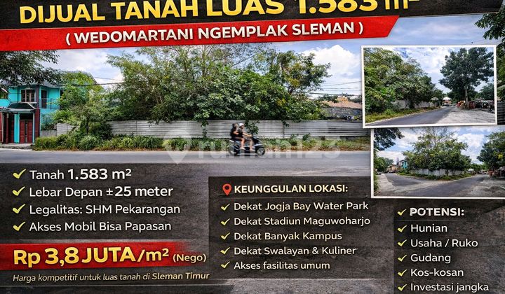 DIJUAL TANAH LUAS 1.583 m² - WEDOMARTANI NGEMPLAK SLEMAN Dijual tanah luas dan strategis berlokasi di Wedomartani, Ngemplak, Sleman - Yogyakarta. Akses mudah, lingkungan berkembang pesat, dan sangat cocok untuk berbagai kebutuhan hunian maupun usaha. SPESIFIKASI Luas Tanah: 1.583 m² Lebar Depan: ±25 meter Legalitas: SHM Pekarangan Akses Jalan: Mobil bisa papasan KEUNGGULAN LOKASI Dekat Jogja Bay Waterpark Dekat Stadion Maguwoharjo Dekat banyak kampus Dekat swalayan & pusat kuliner Akses cepat ke berbagai fasilitas umum POTENSI PENGGUNAAN ✅ Hunian ✅ Usaha / ruko ✅ Gudang ✅ Kos-kosan ✅ Investasi jangka panjang Harga: Rp 3,8 Juta / m² (Nego) ➡️ Harga kompetitif untuk tanah luas di Sleman Timur Minat serius & survei lokasi? Hubungi sekarang, tanah luas dengan akses bagus jarang tersedia.