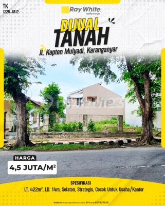 TK 1225xxxx Jl. Kapten Mulyadi, Karanganyar Ini adalah peluang emas bagi para investor dan pebisnis untuk mengakuisisi lahan komersial yang sangat strategis di lokasi premium, Jl. Kapten Mulyadi, Karanganyar. Dengan lebar depan yang ideal (14 m) dan didukung orientasi hadap Selatan, properti ini sangat optimal untuk dikembangkan menjadi kantor, showroom, atau berbagai jenis usaha lainnya. Pastikan Anda tidak melewatkan aset properti siap bangun dengan nilai investasi tinggi ini! - Konsep Tanah: Tanah Komersial Siap Bangun - Luas Tanah (LT): 422 m2 - Lebar Depan (LD): 14 m - Arah Hadap: Selatan - Peruntukan Utama: Cocok untuk Usaha/Kantor Keunggulan Lokasi - Berjarak sekitar 5 menit ke Pasar Karanganyar - Berjarak sekitar 7 menit ke Alun-Alun Karanganyar - Berjarak sekitar 10 menit ke Klinik/RSUD Karanganyar - Berjarak sekitar 20 menit ke Palur Plaza - Berjarak sekitar 25 menit ke Gerbang Tol Gondangrejo - Berjarak sekitar 35 menit ke Bandara Internasional Adi Soemarmo Potensi tanah komersial ini sangat menjanjikan dan strategis, menjadikannya pilihan investasi terbaik dengan risiko rendah dan potensi keuntungan modal yang tinggi. Properti ini sangat cocok untuk investor yang berorientasi pada pengembangan aset komersial, perusahaan yang mencari lokasi kantor atau warehouse baru, maupun end user yang ingin membangun properti multifungsi. Lahan ini dapat dimanfaatkan segera untuk pembangunan kantor yang prestisius, fasilitas komersial, atau aset sewa jangka panjang. Jika Anda tertarik, mari jadwalkan janji temu untuk meninjau properti ini secara langsung.