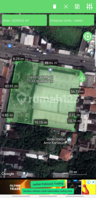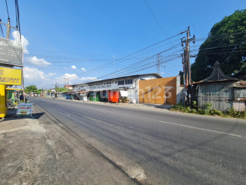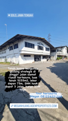 Tanah bonus bangunan gudang strategis di pinggir jalan slamet riyadi kartasura, luas tanah 5255m2, lebar depan 75m, SHM hook dapat 3 jalan, harga 35M nego