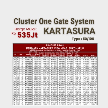 Hunian Strategis 5 Menit Tugu Kartasura, Solo. Cluster Pucangan Kartasura. Harga Launching...!!! Tersedia 2 type : 1. 50/100 m² 2. 60/100 m² Spesifikasi : 1. 2 KT 2. 2 KM 3. Ruang Tamu 4. Ruang Keluarga 5. Dapur 6. Teras 7. Taman 8. Carport Info Sekitar Lokasi: - 200 Mtr Jl. Brigjen Katamso - 2 Menit SD Islam Terpadu Taqiyya Rosyida - 2 Menit Lapangan Ngemplak Kartasura - 3 Menit UIN Solo - 3 Menit Group 2 KOPASSUS - 4 Menit Keraton Kartosuro - 4 Menit PonPes Muhammad Al-Fatih - 6 Menit Tugu Kartasura