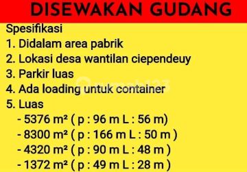 Disewakan Gudang Besar Lokasi desa Ciependeuy Subang Jawa Barat Parkir luas Akses loading kontener Ada 4 gudang - 5376 m² ( P 96m, L 56m) - 8300 m² (P 166m, L 50m) - 4320 m² (P 90m, L 48m) - 1372 m² (P 49m, L28m) Sewa rp 40,000/m/bulan Minimum sewa 3 tahun Afi