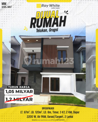 Rumah 2 Lantai Modern Dijual di Telukan Grogol (TURUN HARGA) Lokasi: Telukan, Grogol, Sukoharjo, Jawa Tengah TURUN HARGA! Miliki hunian modern 2 lantai di lokasi strategis Telukan, Grogol! Properti ini menawarkan desain minimalis yang efisien, sangat cocok untuk keluarga muda atau profesional. Berada di lingkungan yang sedang berkembang pesat, rumah ini hanya beberapa menit dari pusat bisnis dan gaya hidup Solo Baru. Spesifikasi Properti: Luas Tanah: 97 m² Luas Bangunan: 120 m² Lebar Depan: 8 meter Jumlah Lantai: 2 Kamar Tidur: 3 Kamar Mandi: 2 Arah Hadap: Timur Sumber Air: PAM Fasilitas: Dapur, Garasi/Carport Keunggulan Lokasi: Pusat Perbelanjaan: ±10 menit (3,6 km) ke Pakuwon Mall Solo Baru ±12 menit (4 km) ke The Park Mall Solo Baru Fasilitas Kesehatan: ±5 menit (2 km) ke RS Indriati Solo Baru ±10 menit (3,9 km) ke RS Dr. Oen Solo Baru Pasar Tradisional: ±3 menit (1 km) ke Pasar Telukan Properti ini sangat ideal untuk keluarga muda atau investor yang mencari rumah dijual di Sukoharjo dengan aksesibilitas tinggi. Potensi nilai investasi di area Grogol, sebagai penyangga utama Solo Baru, diprediksi akan terus meningkat. Jangan lewatkan kesempatan memiliki hunian modern ini selagi harga turun. Hubungi kami segera untuk detail lebih lanjut dan jadwalkan survei!