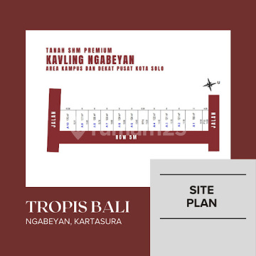Dijual Tanah Kavling dan Rumah Tropis Bali di Ngabeyan, Kartasura - Harga Mulai Rp 640 Juta Jual kavling dan rumah dengan konsep "Tropis Bali" di lokasi premium, Ngabeyan, Kartasura. Properti ini sangat cocok bagi Anda yang mencari hunian eksklusif dengan suasana yang tenang namun tetap dekat dengan pusat kota. Pilihan Properti: Tanah Kavling: SHM Premium, berbagai ukuran mulai dari 121 m² hingga 170 m² (A1-A10). Rumah: Tipe rumah dengan desain modern Tropis Bali, dilengkapi 2 kamar tidur, 1 kamar mandi, ruang tamu & dapur, dan carport. Harga: Mulai dari Rp 640 Juta (harga untuk tipe rumah). Keunggulan: Lokasi Strategis: Berada di area kampus dan dekat dengan pusat kota Solo. Desain Unik: Mengusung konsep arsitektur Tropis Bali yang estetik dan nyaman. Akses Mudah: Jalan depan kavling lebar (Row 5m), memudahkan akses kendaraan. Legalitas Terjamin: Sertifikat Hak Milik (SHM) untuk semua kavling.