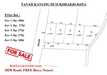 Tanah Dijual Sukoharjo Tanah Kavling Murah di sukoharjo kota - Ada 5 tanah kavling yg di jual - Harga Mulai 275jtan. - Luas Mulai 127 M² sampai dengan luas 184 M² - Bebas Biaya Notaris - Akses Jalan Aspal - Padat Penduduk, Jauh Makam & Sungai - Sangat Cocok Untuk Investasi / Hunian - Sangat Pontensial Untuk Investasi..