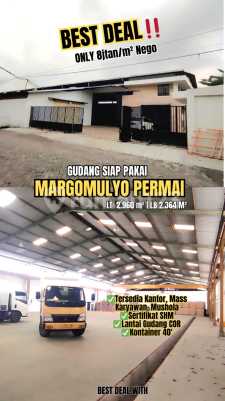 GUDANG SIAP PAKAI Margomulyo Permai LT 2.960m² ( 38 x 78 ) LB 2.364m² Luas Gudang 1.500m² ( 25x60 ) Ada ruang kantor ( 6x25 ) dan Showroom ( 10x30 ) Tersedia mess karyawan, kamar mandi karyawan, dan musholla SHM Hadap Timur PLN 53KVA Jual Rp 25M nego Best Deal TEV