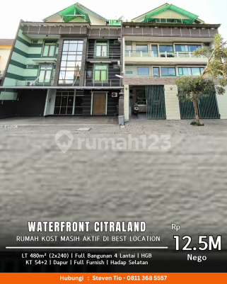 HOT KOS²-an Dijual Rumah Kost Masih Aktif di Best Location Waterfront Citraland LT 480m² ( 2x 240m² ) Full Bangunan 4 Lantai Total KT 54 ( KM Dalam ) Total KT 2 Pembantu Total Dapur 2 + Ruang Komunal Full Furnish + Elektronik Listrik 41.000 Watt Hadap Selatan HGB Harga Rp 12,5M nego Best Deal STEVEN TIO Wa.me/6281xxxxxxxx Visit us IG. @propertybagus.sby