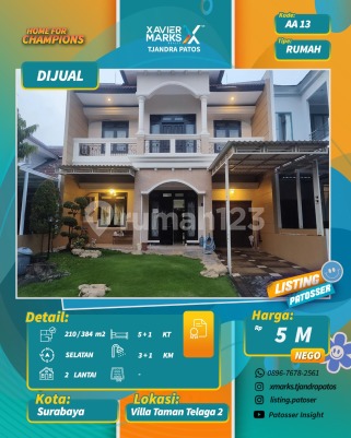 Dijual Rumah 2 lantai Villa Taman Telaga 2 Hadap selatan LT 210m²(10x21) LB ±384 m² KT 5+1 KM 3+1 Harga Jual 5M(nego) More info : Arief - haus.luxe.property 0813xxxxxxxx - Xavier Marks Tjandra Patos Surabaya Barat dekat Jalan Mayjen Sungkono, HR Muhammad, Raya Lontar, Bukit Darmo Boulevard, Raya Kupang Indah, Kupang Jaya, Tandes, Manukan, Margomulyo, Darmo harapan, Rumah Sakit National Hospital, RS Mitra Keluarga Lontar, RS BDH, RS Royal Taruma, RS PHC Surabaya barat, Pakuwon Mall, Lenmarc Mall, Spazio Tower, PTC, Loop Graha Family, Universitas Ciputra, Sekolah Ciputra, Cita Hati West Campus, Sekolah Gloria, Pasar Lontar, Pasar Dukuh Kupang, Pasar Tandes, pasar Lakarsantri
