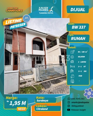 DIJUAL RUMAH BARU GRESS DI CITRALAND LT 90 m² LB 180 m² 2 lantai KT 3+1 KM 3+1 Hadap Selatan HGB s/d 2027 Lantai marmer Harga 1,95 M nego Info: Brigitta Wong 0811309xxxx Xmarks Tjandra Patos Surabaya Barat dekat Jalan Mayjen Sungkono, HR Muhammad, Raya Lontar, Bukit Darmo Boulevard, Raya Kupang Indah, Kupang Jaya, Tandes, Manukan, Margomulyo, Darmo harapan, Rumah Sakit National Hospital, RS Mitra Keluarga Lontar, RS BDH, RS Royal Taruma, RS PHC Surabaya barat, Pakuwon Mall, Lenmarc Mall, Spazio Tower, PTC, Loop Graha Family, Universitas Ciputra, Sekolah Ciputra, Cita Hati West Campus, Sekolah Gloria, Pasar Lontar, Pasar Dukuh Kupang, Pasar Tandes, pasar Lakarsantri