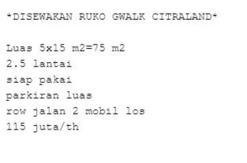 Sewa Ruko Citraland Surabaya,ewa Ruko Citraland Surabaya Ruko Siap Pakai di G WALK Citraland - LOKASI PREMIUM,Ruko Murah, Sewa Ruko Murah, Sewa Kios, Ruko Disewakan, Jual Ruko, Sewa Ruko Bulanan, Sewa Kantor, Sewa Tempat Usaha, Ruko Dijual Kesempatan terbatas buat Anda dapatkan ruko strategis dengan return investasi tinggi di Citraland, Surabaya. Ruko ini menawarkan kelengkapan fasilitas serta memiliki nilai tepat yang siap untuk segera Anda miliki, utamanya bagi Anda yang mencari hunian di lokasi yang terjangkau. Kondisi properti ini bagus dengan detail properti sebagai berikut: - Kamar Mandi: 1 - Sertifikat: Lainnya(PPJB, Girik, Adat,dll) - Kondisi Perabotan: Unfurnished Tidak hanya itu, namun properti ini juga memiliki keunggulan sebagai berikut: - Bebas Banjir. - Siap Huni. Lokasi Strategis terletak di Citraland, properti ini memudahkan akses Anda ke fasilitas-fasilitas utama dan unggulan Harga yang sangat kompetitif yaitu, Rp. 9.583.333, ruko ini siap menjadi milik Anda! Nikmati segala kemudahan dan berbagai keunggulan menarik saat properti berkualitas ini milik Anda. Hubungi segera dan dapatkan informasinya ataupun cek unit!