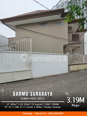 Darmo2-an Rumah New gress LT 162 m² LB 222 m² (2 Lantai) KT4 + 1 | KM 3+1 Listrik daya 2.200 watt Air PDAM Hadap Selatan Sertifikat HGB Rp 3.19M Nego Best Deal STEVEN TIO WINMAX Wa.me/62811368xxxx Visit us ******** IG. @propertybagus.sby