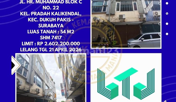 DIJUAL RUKO VIA LELANG DI DUKUH PAKIS SURABAYA (RUKO SURYA INTI PERMATA) - LELANG KPKNL HALO INVESTOR KOTA SURABAYA SIDOARJO!! LELANG RUKO KPKNL - HARGA MIRING, LEGAL, AMAN! PROPERTI INCARAN BANYAK INVESTOR. COCOK BUAT KAMU YANG NGGAK MAU KETINGGALAN PELUANG EMAS! RUKO SURYA INTI PERMATA JL. HR. MUHAMMAD BLOK C NO. 22 KEL. PRADAH KALIKENDAL, KEC. DUKUH PAKIS - SURABAYA LUAS TANAH : 54 M2 SHM 7417 LIMIT : RP 2.602.200.xxx LELANG TANGGAL 21 APRIL 2026 - PUKUL 10.00 WIB * CASH ONLY * UNTUK SAAT INI HANYA BISA VIEWING/DILIHAT DARI DEPAN/LUAR SAJA * HARGA BELUM TERMASUK BIAYA - BIAYA DAN MERUPAKAN LIMIT DASAR AWAL KESEMPATAN LANGKA PUNYA RUKO DARI LELANG KPKNL YANG LEGAL, AMAN, DAN BERNILAI TINGGI UNTUK MASA DEPAN. COCOK BANGET BUAT KAMU YANG CARI INVESTASI PROPERTI DENGAN HARGA MIRING!