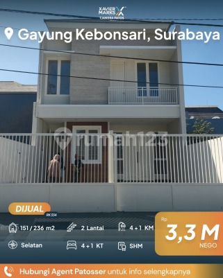 For sale Rumah 2 lantai Gayung kebonsari Surabaya LT 151 m2 (7x21.6) LB 236 m2 KT 4 + 1 kamar pembantu KM 4 + 1 KM pembantu SHM Hadap Selatan 2 lantai Row 2 mobil Car port 2 mobil Kusen aluminium Lantai granite 60/60 Tersedia instalasi AC setiap kamar Listrik 2200 Watt Harga Rp 3.3 M nego More info: Robert -0823xxxxxxxx Xavier Mark Tjandra Patos Surabaya Selatan dekat Jalan Ahmad Yani, Jemursari, Tenggilis Mejoyo, Gayung Kebonsari, Pagesangan, Ketintang, Margorejo, Siwalankerto, Rumah Sakit Royal Surabaya, RS Bhayangkara, RS Islam Jemursari, RSAL Dr. Ramelan, RS Marina, Mall CITO City of Tomorrow, Royal Plaza, Maspion Square, Plaza Marina, DTC Wonokromo, UNESA Ketintang, Universitas Kristen Petra Siwalankerto, PENS, STIKOM Surabaya, Pasar Wonokromo, Pasar Karah, Pasar Gayungan, Pasar Margorejo Indah, Masjid Nasional Al-Akbar Surabaya, Terminal Joyoboyo, Bundaran WARU, Taman Pelangi, Darmo Park