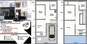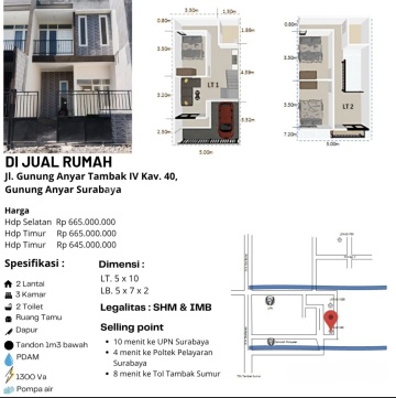 Av09 Kesempatan terbatas buat Anda dapatkan rumah nyaman dengan return investasi tinggi di Gununganyar, Surabaya. Rumah ini menawarkan lokasi yang strategis serta memiliki jumlah lantai 2 yang siap untuk segera Anda miliki, utamanya bagi Anda yang mencari hunian di lokasi yang terjangkau. Kondisi properti ini bagus dan memiliki desain minimalis yang menambah daya tarik dan estetika properti ini. Rumah ini berada di wilayah strategis. Detail Properti ini adalah: - Kamar Tidur: 3 - Kamar Mandi: 2 - Sertifikat: SHM - Sertifikat Hak Milik - Daya Listrik: 1300 watt - Arah Bangunan: Menghadap Selatan - Kondisi Perabotan: Unfurnished Tersedia berbagai fasilitas lengkap, seperti: - Akses Parkir. Tidak hanya itu, namun properti ini juga memiliki keunggulan sebagai berikut: - Siap Huni. - Bebas Banjir. - Bisa KPR. - Dekat Pusat Perbelanjaan. - Dekat Sekolah Internasional. - Dekat Akses Bandara. - Dekat Sekolah Negeri. - Dekat Universitas. - Dekat Fasilitas Kesehatan. - Dekat Akses Tol. Lokasi Strategis terletak di Gununganyar, properti ini memudahkan akses Anda ke fasilitas-fasilitas utama dan unggulan. Harga yang sangat kompetitif yaitu, Rp. 675 juta, rumah ini siap menjadi milik Anda! Nikmati segala kemudahan dan berbagai keunggulan menarik saat properti premium ini milik Anda. 09. Gunung Anyar Tambak Surabaya Timur 3 unit SHM IMB 1300 watt PDAM A. Hadap Timur LT 5 x 20 = 50 LB ± 70 KT 3 KM 2 Dapur, Carport 1 700 jt nego B. Hadap Selatan LT 5 x 20 = 50 LB ± 70 KT 3 KM 2 Dapur, Carport 1 700 jt nego C. Hadap Timur Hook LT 48 LB ± 70 KT 3 KM 2 Dapur, Carport 1 675 jt nego Selling Point: ± 10 menit ke UPN Surabaya ± 4 menit ke Poltek Pelayaran Surabaya ± 8 menit ke Tol Tambak Sumur Mau jual beli properti dalam dan luar negeri Hubungi Ray White Darmo Permai Henry Soerya HP/WA 0812327xxxx ********