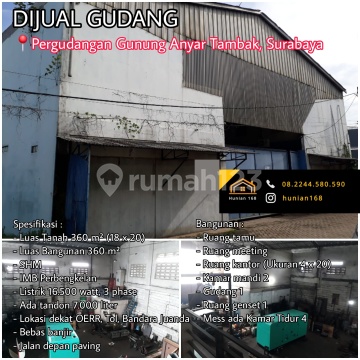 DIJUAL GUDANG Pergudangan Gunung Anyar Tambak, Surabaya Spesifikasi : - Luas Tanah 360 m² (18 x 20) - Luas Bangunan 360 m² - SHM - IMB Perbengkelan - Listrik 16.500 watt, 3 phase - Ada tandon 7.000 liter - Lokasi dekat OERR, Tol, Bandara Juanda - Bebas banjir - Jalan depan paving - Harga 2.95 M Nego Bangunan : - Ruang tamu - Ruang meeting - Ruang kantor (Ukuran 4 x 20) - Kamar mandi 2 - Gudang 1 - Ruang genset 1 - Mess ada Kamar Tidur 4