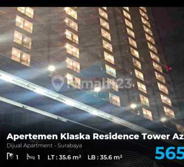 Apartment di Surabaya Apertemen Klaska Residence Tower Az Luas Tanah 35.6 m² Dimensi 5 x 7.5 m Luas Bangunan 35.6 m² 1 Kamar Tidur 1 Kamar Mandi Interior - Unfurnished Hadap Utara Listrik 1300 watt Status : SHM Highlight : 1. Swimming Pool, Sauna, Game room, Small theathre,Taman, dll 2. View menghadap Pool & kota