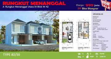 RUNGKUT MENANGGAL Rungkut Menanggal Utara LT 5x10 = 50m2 LB 82m2 (2 Lantai) KT 3 KM 2 Carport 1 SHM PDAM 2200w Harga 999Jt
