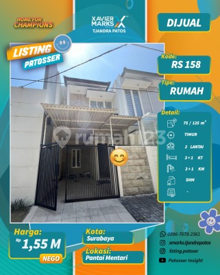 Dijual Rumah 2 Lantai Pantai Mentari SHM, IMB, Blueprint, Pbb Lengkap Row jalan 3 mobil PLN 4400 Watt PDAM Atap galvalum, genteng flat Cisangkan Kusen aluminium Granit tile 60x60 Sanitair Toto Lt 5x15.2, Lb 125 3+1 KT, 3+1 KM Kamar tidur utama (kamar mandi dalam) Hadap Timur Carport 1 mobil Harga : 1.550 M Robi - 08785193xxxx XMarks Patos Pakuwon City Mall Surabaya Timur dekat Jalan Raya MERR, Rungkut, Kenjeran, Arif Rahman Hakim, Kertajaya, Dharmahusada, Kalijudan, Manyar, Rumah Sakit Premier, RS Haji, RS Unair, RS Mitra Keluarga, RS Gotong Royong, Galaxy Mall, Pakuwon City Mall, Transmart Rungkut, Kampus ITS, UNAIR, Sekolah Kristen Petra, Sekolah Gloria Galaxy, Pasar Keputran Timur, Jembatan Kenjeran, Taman Surabaya, Harmoni Keputih