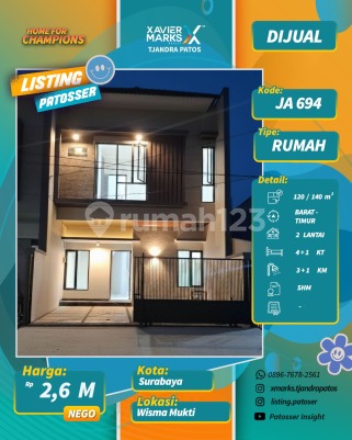 Dijual Rumah baru gress Lokasi Wisma Mukti Klampis UNIT A (kotak) Ready unit LT : 78m² Dimensi : 6 x 13 LB : 118m² KT : 3 KM : 3 SHM. PLN 3500w Hadap : Barat Jalan row 4 mobil Harga : 1.85M nego UNIT B (hook) On progress, ready Jan 2026 LT : 120m² Dimensi : 8,4 x 14,5 LB : 140m² KT :4 + 1, KM : 3 + 1 SHM. PLN 3500w Hadap : Barat Utara Jalan row 4 mobil Harga : 2.6M nego Hubungi : Jenni_08224587xxxx XMarks Patos PAKUWON CITY MALL Surabaya Timur dekat Jalan Raya MERR, Rungkut, Kenjeran, Arif Rahman Hakim, Kertajaya, Dharmahusada, Kalijudan, Manyar, Rumah Sakit Premier, RS Haji, RS Unair, RS Mitra Keluarga, RS Gotong Royong, Galaxy Mall, Pakuwon City Mall, Transmart Rungkut, Kampus ITS, UNAIR, Sekolah Kristen Petra, Sekolah Gloria Galaxy, Pasar Keputran Timur, Jembatan Kenjeran, Taman Surabaya, Harmoni Keputih