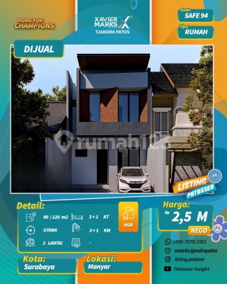 Jual Rumah 2 Lantai Minimalis Manyar, Surabaya Timur LT 6,4 x 14 (90) LB 120 KT 3+1 KM 3+1 Carport 2 Mobil Row Jalan 3 Mobil Listrik 3500watt Hadap Utara HGB Harga 2,5M Serah Terima Maret 2026 More Info : SAFE ESTATE - 0819222xxxx Link Whatsapp : ******** Part of XMarks Patos PAKUWON CITY MALL Surabaya Timur dekat Jalan Raya MERR, Rungkut, Kenjeran, Arif Rahman Hakim, Kertajaya, Dharmahusada, Kalijudan, Manyar, Rumah Sakit Premier, RS Haji, RS Unair, RS Mitra Keluarga, RS Gotong Royong, Galaxy Mall, Pakuwon City Mall, Transmart Rungkut, Kampus ITS, UNAIR, Sekolah Kristen Petra, Sekolah Gloria Galaxy, Pasar Keputran Timur, Jembatan Kenjeran, Taman Surabaya, Harmoni Keputih