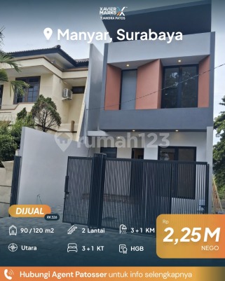 RUMAH MODERN 2 LANTAI (Home of young professionals) Manyar Surabaya Lokasi Berkelas (Classy House) Row Jalan Lebar = 3 Mobil Carport = 2 Mobil Jejer Longgar .Lt = 6,4x14 m = 90 m² Lb = 2 Lt ( 120 m² ) Kamar Tidur = 3+1 (Comfortable) Kamar Mandi = 3+1 (Luxurious) Sertifikat HGB Listrik = 3.500 VA Air PDAM Rumah Hadap = Utara Harga = 2,25 M (Belum terhitung ppn 11%) BONUS UNTUK PEMBELI = 1. Lampu² seluruh Ruangan Rumah 2. Exhause Fan 3. Tandon Air Atas & Bawah 4. Pompa Air Atas & Bawah More info: Robert -0823xxxxxxxx Xavier Mark Tjandra Patos Surabaya Timur dekat Jalan Raya MERR, Rungkut, Kenjeran, Arif Rahman Hakim, Kertajaya, Dharmahusada, Kalijudan, Manyar, Rumah Sakit Premier, RS Haji, RS Unair, RS Mitra Keluarga, RS Gotong Royong, Galaxy Mall, Pakuwon City Mall, Transmart Rungkut, Kampus ITS, UNAIR, Sekolah Kristen Petra, Sekolah Gloria Galaxy, Pasar Keputran Timur, Jembatan Kenjeran, Taman Surabaya, Harmoni Keputih