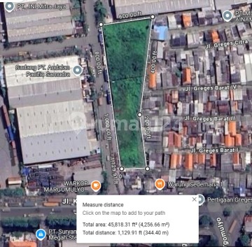 DIJUAL TANAH JL. GREGES JAYA KAWASAN INDUSTRI STRATEGIS SURABAYA HANYA 30 mtr JALAN RAYA BESAR DEKAT PERGUDANGAN MARGOMULYO SANGAT MURRAH..!! SHM LT: 4.292 m² Lebar depan 130 meter KEUNTUNGAN LEBAR TANAH 130 meter: - Bisa di-split jadi banyak gudang - Memudahkan manuver truk & alat berat - Sangat mudah pengaturan IN & OUT kendaraan & penyimpanan barang - Parkir truk jadi lebih teratur LINGKUNGAN PERGUDANGAN/INDUSTRI: Hanya +- 30 meter saja ke jalan besar TAMBAK LANGON Row jalan lebar 17 meter! Kontainer 40 feet leluasa manuver Lingkungan pergudangan & industri, juga penyimpanan peti kemas LOKASI STRATEGIS: Akses mudah ke dalam & luar kota Akses mudah ke Pelabuhan Internasional & Terminal Osowilangun Dekat TOL, Tandes, Margomulyo Akses mudah via TOL ke: Gresik, Sidoarjo, Surabaya Kota & Pelabuhan COCOK UNTUK: 1. Gudang besar 2. Di-split menjadi 10-11 gudang kecil 3. Parkir truk 4. Depo kontainer JUAL CEPAT! Rp 6,5 jt/m2 saja MURAH!! Hub. YASUL WA: 0812312xxxx *NB: Jika Bpk/Ibu berkenan survey lokasi, mohon tidak mendadak & silahkan buat janji terlebih dahulu minim sehari sebelumnya. Terima kasih. FR.