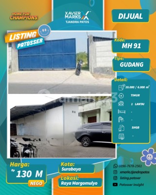DIJUAL GUDANG Raya Margomulyo Surabaya Spesifikasi : * LT : 10.800 m² * LB : 6000 m * Deminsi : 90x120 * Surat : SHGB * Hadap ke Timur * Listrik : 16 000 W * Ada kantor * Air sumur Harga : 130 M Hubungi : Makrus Hasan (aan) HP : 08571604xxxx XM Tjandra Patos Surabaya Barat dekat Jalan Mayjen Sungkono, HR Muhammad, Raya Lontar, Bukit Darmo Boulevard, Raya Kupang Indah, Kupang Jaya, Tandes, Manukan, Margomulyo, Darmo harapan, Rumah Sakit National Hospital, RS Mitra Keluarga Lontar, RS BDH, RS Royal Taruma, RS PHC Surabaya barat, Pakuwon Mall, Lenmarc Mall, Spazio Tower, PTC, Loop Graha Family, Universitas Ciputra, Sekolah Ciputra, Cita Hati West Campus, Sekolah Gloria, Pasar Lontar, Pasar Dukuh Kupang, Pasar Tandes, pasar Lakarsantri