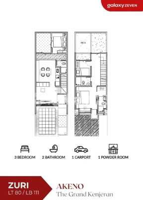 tgk-zuri Akeno sangat sesuai untuk keluarga kecil maupun keluarga baru yang akan memulai kisah baru seiring dengan matahari yang menyingsing di pagi hari. Akeno Homes SIMPLICITY | SMART | AESTHETIC JUAL RUMAH COMPACT MINIMALIS KONSEP JEPANG SURABAYA TIMUR TIPE ZURI LT 80 ( 5x16 ), LB 111 2 Lantai, KT 3, KM 2+1 1 Carport, Taman PLN 3.500 HGB, Hadap Selatan Harga Promo : 2.185.982.xxx* *Bisa berubah sewaktu-waktu FASILITAS OUTDOOR: - Hana Lake Terrace - Panoramic Swing - Jogging Track - Kid Playground - Niji Picnic Ground - dan Co-Working Space LOKASI/JARAK: 1 km - Alfamart The Grand Kenjeran 1,4 km - Raya Kenjeran 2 km - RS Mitra Keluarga 2,3 km - Raya MERR, RS Ibu Anak Kendangsari Merr 5,4 km - Pakuwon City Mall 6 km - Galaxy Mall 8,2 km - Stasiun Gubeng 19 km - Juanda Airport SPESIFIKASI BANGUNAN 1) PONDASI : - Tiang pancang 2) DINDING : - Bata ringan putih + aci cat dinding - Kamar mandi finishing keramik ex. Roman 3) LANTAI : Granite tile ex. Roman 4) PLAFOND : - Interior gypsumboard ex. Elephant finishing cat - Eksterior MR board ex. Elephant finishing cat 5) ATAP : - Rangka atap baja ringan - Genteng beton CP accent hitam 6) PINTU & JENDELA : - Pintu utama solid engineering wood meranti finishing HPL - Pintu dalam semi solid engineering wood meranti finishing HPL - Hardware Accesories by Dekkson - Jendela aluminium Madela by YKK AP 7) SANITAIR : - Wastafel, kran, closet, shower ex TOTO 8) LISTRIK : - 3.500 watt 9) AIR BERSIH : - PDAM + tandon bawah 1,5 m³