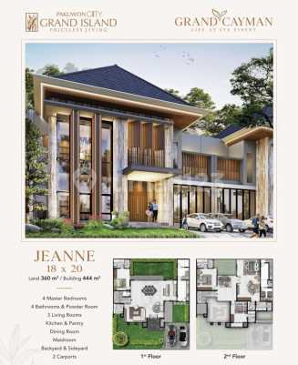 Tipe Jeanne ~ Cluster Grand Cayman ▶️ Uk. 18x20 ▶️ LT 360 / LB 444 Surabaya Timur || Jawa Timur Fasilitas : * 4 Master Bedroom * 4 bathroom * Living Room * Foyer are * Kitchen & Pantry * Dinning room * Maidroom * Backyard & Sideyard (bisa dibikin utk area kolam renang/taman) * 2 carports Harga incl PPN tanpa interior 15.750.000.xxx ▶️ spesial disc ▶️ Cara bayar KPR / cash keras ▶️ Dp 10% Blm tmsk biaya2 lainnya : Biaya lain2 : 1. Biaya ppjb notaris per unit 2. biaya kpr bank per unit 3. biaya bphtb & ppjb kurleb 5% dr harga include ppn per unit