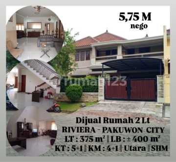 TURUN HARGA DIJUAL Rumah 2 lt di Pakuwon City - Surabaya Timur Cluster : Riviera LT : 15 x 25 = 375 m² LB : ± 400 m² 2 Lantai KT : 5+1 KM : 4+1 Listrik 4400 watt PDAM Garasi : 2 mobil Carport : 4 mobil Hadap Utara SHM Harga Jual 6 M - turun jadi 5,75 M - nego EKG