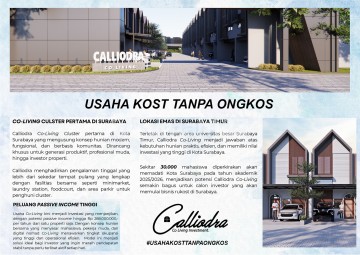 Calliodra Co Living, Surabaya. Rumah Kos berkonsep co-living persis di sebelah UPN Veteran Lokasi 0 jalan raya Dikelilingi 4 kampus besar Lingkungan sudah terbentuk, One gate system & keamanan 24 jam Ukuran luas tanah 5 x 13 Harga start 1,8 M an Promo : -Fully furnished (Spring bed, lemari, meja, AC) setiap kamar -Free BPHTB, AJB, Balik Nama (terima SHM) dan semua biaya KPR -Cara Bayar KPR: Free Angsuran sampai serah terima rumah (Untuk 5 Unit pertama) Unit ready bangun Type Blossom 90/65m2 LT : 5x13 = 65 m2 LB : 90 m2 (2 lantai) Kamar Tidur : 5 Kamar Mandi : 5 Listrik : 900 watt x 5 kamar 1300 watt induk Harga Cash/KPR 1.800.000.xxx Type Calliodra 180/65m2 LT : 5x13 = 65 m2 LB : 180 m2 (2,5 lantai) Kamar Tidur : 12 Kamar Mandi : 12 Listrik : 900 watt x 12 kamar 1300 watt induk Harga cash/KPR 2.850.000.xxx Free Biaya2 : Biaya AJB+Ppn Biaya Bphtb Biaya Baliknama Biaya Notaris Biaya KPR Free Cicilan sd STU *Chat WA :* Jasmin Konig Property 08133175xxxx ******** *Telegram :* ******** *Catalog on WhatsApp :* ******** Dropped pin pin : Gunung Anyar, Surabaya, East Java ********