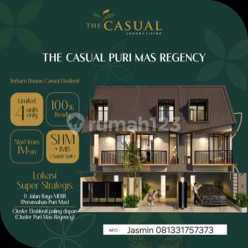 Dijual 4 rumah baru, The Casual Purimas Regency, Purimas, Surabaya Unit A LT : 4x11 = 44m2 LB : 72 m2 (3 lantai split level) Kamar Tidur : 3 Kamar Mandi : 3 Hadap : Barat Daya Carport : 1 mobil SHM Harga : Rp. 1,75M Unit B Unit A LT : 4x11 = 44m2 LB : 72 m2 (3 lantai split level) Kamar Tidur : 3 Kamar Mandi : 3 Hadap : Barat Daya Carport : 1 mobil SHM Harga : Rp. 1,75M Unit C LT : 4,5x11 = 47 m2 LB : 119 m2 (3 lantai split level) Kamar Tidur : 3 Kamar Mandi : 3 Hadap : Barat Daya & Tenggara Carport : 2 mobil SHM Harga : Rp. 2,1M Unit D LT : 5x12 = 60 m2 LB : 99 m2 (3 lantai split level) Kamar Tidur : 3 Kamar Mandi : 3 Hadap : Tenggara Carport : 2 mobil SHM Harga : Rp. 2,2M NOTES : -tiap unit dilengkapi Jacuzzi room -unit kosongan tanpa perabot PROMO sd Agustus 2025 : Free : Pajak Pembeli, AJB/Biaya notaris, tandon atas & bawah dan pompa air *Chat WA :* Jasmin Konig Property 0813xxxxxxxx ******** *Telegram :* ******** *Catalog on WhatsApp :* ********