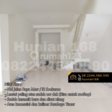 DIJUAL RUKO STRATEGIS Jalan Raya Merr / IR Soekarno, Surabaya Timur Spesifikasi : - Luas Tanah 135 m² (5 x 27) - Luas Bangunan +/ 400 m² (5 x 18.5) - 4.5 lantai - SHM - Listrik 4.400 watt - Harga 5.5 M Nilai Plus : - Nol Jalan Raya Merr / IR Soekarno - Lantai paling atas sudah cor dek (Bisa untuk rooftop) - Sudah keramik baru dan dicat ulang - Area komersial dan kuliner Surabaya Timur