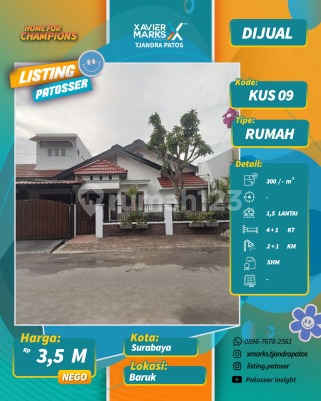 Dijual Rumah siap huni, bagus Baruk Surabaya Lingkungan bersih dan tenang. Row jalan lebar sekali. Cocok utk rumah tinggal, lingkungan tenang dan asri Keamanan 24 jam, lingkungan komplex dilengkapi CCTV Luas Tanah: 12x25m (300m²) Bangunan 1.5lantai Surat : SHM KT : 4+1 KM : 2+1 Gudang 2 Ruang utama terpisah dg ruang service, pintu akses terpisah 1 Garasi dan 1 Carport Listrik 5500 watt PDAM kota Surabaya Gas PGN Harga 3.5 M Info : Kuswanto XMTP 08123574xxxx