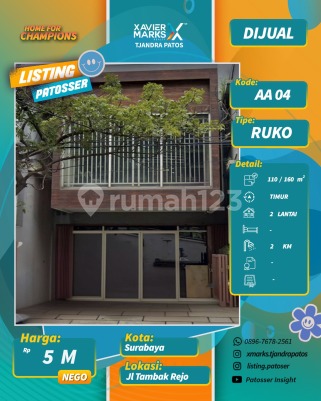 Dijual Ruko 2 lantai 0 jalan raya (depan Kaza Mal Kapas Krampung) - Surabaya Hadap : Timur LT : 110m² (5x22) LB : ±160m² KM : 2 (1+1) Tiap lantai kamar mandi 1 Listrik : 10.500W Air : pdam dan sumur bor Sertifikat : Surat ijo Harga Jual : 5M(nego) More info : Arief - ********.property 0813566xxxx - Xavier Marks Tjandra Patos Surabaya Utara dekat Jalan Rajawali, Kembang Jepun, Perak, Kalimas, Nyamplungan, Dupak, Pegirian, Rumah Sakit PHC, RS Al Irsyad, RS Pelabuhan, RSUD Soewandhie, Pasar Atom, ITC Mega Grosir, Pusat Grosir Dupak, Kampus Universitas Hang Tuah, MAN 1 Surabaya, SMKN 2 Surabaya, Masjid Sunan Ampel, Jembatan Merah, Pelabuhan Tanjung Perak, House of Sampoerna, Kya-Kya, Tugu Pahlawan, Jembatan Suramadu, Kenjeran Lama, Sentra Ikan Bulak, Wisata Mangrove, Taman Prestasi, Kalimas Riverfront.