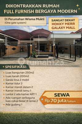 Dikontrakkan rumah FULL FURNISH bergaya modern Di Perumahan Wisma Mukti (One gate system) SANGAT DEKAT HOKKY MERR GALAXY MALL SPESIFIKASI: Luas bangunan 250m2 Luas tanah 200m2 Garasi bisa 2 mobil Kamar tidur 3 Kamar mandi dalam 2 Kamar mandi tamu 1 Lantai 2 ada kamar ART 1 Ada ruangan serbaguna luas cukup besar di lantai 2 Ada gudang 1 Fasilitas : AC di 3 kamar tidur Lemari di 2 kamar tidur Water heater di kamar mandi utama Ada 1 Meja kerja 2 kursi kerja 1 Sofa set 1 Meja tamu 1 cooker hood 1 ranjang 160x200 kingkoil 1 ranjang 180x200 kingkoil Connecting door 1 brankas besar 2 kulkas 1 jemuran 1 buffet TV Ada CCTV set + DVR Ada 1 TV buat CCTV Kitchen set 2 tabung filter air Sewa rp. 70 juta/tahun MA