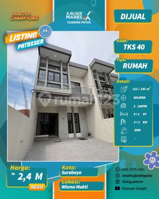 Ready 2unit rumah baru Wisma Mukti - Klampis Unit A LT 112m² ( 6x18,5 ) LB 183m² Bangunan 2 lantai 4KT + 1 3KM + 1 (1KM dalam-Atas) SHM Hadap Selatan Tandon Bawah + Atas Sanitary TOTO PDAM PLN 2200W SHM 2,4 M nego Unit B LT 107m² ( 6x18 ) LB 172m² Bangunan 2 lantai 4KT + 1 3KM + 1 (1KM dalam-atas) SHM Hadap Selatan Tandon Bawah + Atas Sanitary TOTO PDAM PLN 2200W SHM 2,250 M nego More info Tony 0813xxxxxxxx Xavier Marks Tjandra Patos Surabaya Timur dekat Jalan Raya MERR, Rungkut, Kenjeran, Arif Rahman Hakim, Kertajaya, Dharmahusada, Kalijudan, Manyar, Rumah Sakit Premier, RS Haji, RS Unair, RS Mitra Keluarga, RS Gotong Royong, Galaxy Mall, Pakuwon City Mall, Transmart Rungkut, Kampus ITS, UNAIR, Sekolah Kristen Petra, Sekolah Gloria Galaxy, Pasar Keputran Timur, Jembatan Kenjeran, Taman Surabaya, Harmoni Keputih