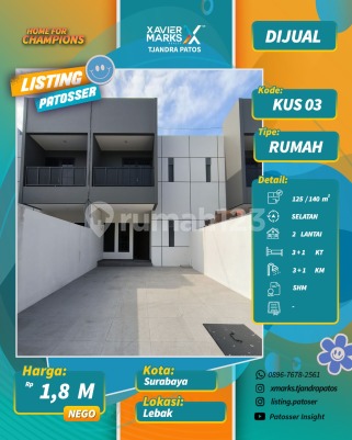 Dijual 4 unit rumah baru Daerah Lebak Surabaya 3 Kamar mandi dalam LT. 125 m² ( 5x25 ) LB 140 KT 3+1 KM 3+1 Semua kamar besar2 Dan ada kamar mandi dalam ( ada 3 master bedroom ) Hadap selatan Row jalan 2.5 Mobil ( 6 meter ) Carport 2 mobil Shm imb pbb ready Harga 1.8m nego Info : Kuswanto - 08123574xxxx Xmarks Tjandra Patos Surabaya Timur dekat Jalan Raya MERR, Rungkut, Kenjeran, Arif Rahman Hakim, Kertajaya, Dharmahusada, Kalijudan, Manyar, Rumah Sakit Premier, RS Haji, RS Unair, RS Mitra Keluarga, RS Gotong Royong, Galaxy Mall, Pakuwon City Mall, Transmart Rungkut, Kampus ITS, UNAIR, Sekolah Kristen Petra, Sekolah Gloria Galaxy, Pasar Keputran Timur, Jembatan Kenjeran, Taman Surabaya, Harmoni Keputih