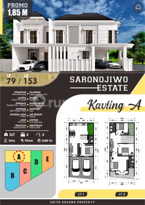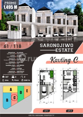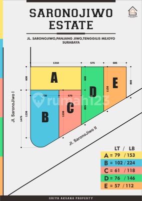 SARONOJIWO SURABAYA Saronojiwo, Panjang Jiwo, Tenggilis Mejoyo Ready 5 Unit Cantik-Cantik Kavling A - LT 79m2 - LB 153m2 (2 Lantai) - KT 4 - KM 3 - SHM - PDAM - 2200w - Ada Carport - Hadap Barat HARGA 1,85 M Kavling B - LT 102 - LB 224 (2 Lantai) - KT 3+1 - KM 3+1 - SHM - Hadap Selatan - Ada Carport - PDAM - 2200w HARGA 2,15 M Kavling C - LT 61m2 - LB 118m2 (2Lantai) - KT 3 - KM 3 - SHM - PDAM - 2200w - Ada Carport - Hadap Selatan HARGA 1,495 M Kavling D - LT 76m2 - LB 146m2 (2 Lantai) - KT 4 - KM 3 - SHM - PDAM - 2200w - Hadap Selatan - Carport HARGA 1,75 M Kavling E - LT 57m2 - LB 112m2 (2 Lantai) - KT 3 - KM 3 - SHM - PDAM - 2200w - Carport - Selatan HARGA 1,5 M
